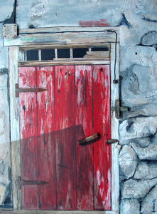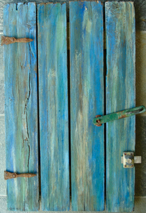 2023Een detail van een oude deur in blauw, burnt sienna, zwart en wit.