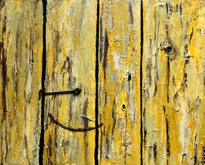 2018Een deurfragment in geel met een echte roestige haak, spijkers en oneffenheden erop.