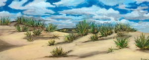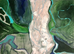 2023Zand, water, aarde mengen door de acrylverf en dan los gaan op het doek.